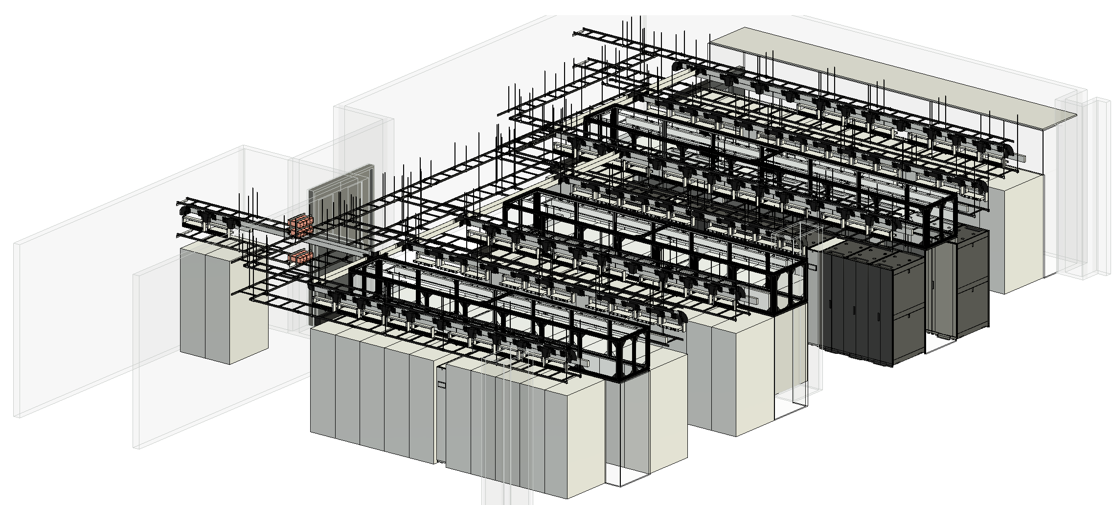 BIM-based coordination of rack layouts, pathways, and clearances supporting high-density and mission-critical environments. This example demonstrates how MDC applies the same disciplined design approach used in standard IT spaces to more demanding infrastructure requirements.